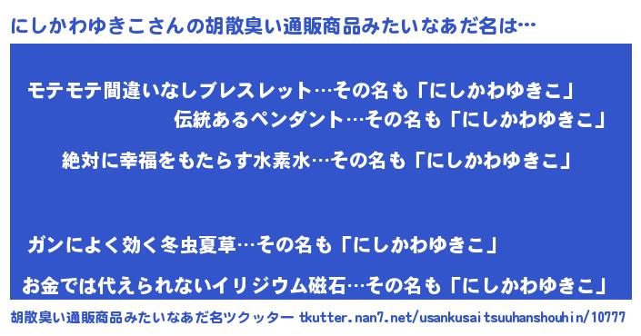 | ヘコむあだ名 | 『にしかわゆきこ(苦笑)』『にしふぇ~』 |