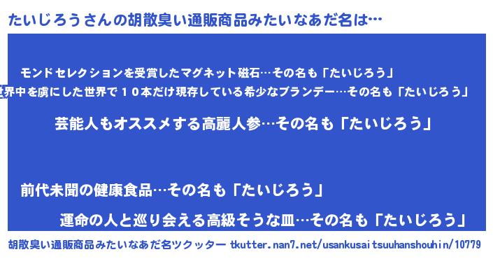 | 恥ずかしいあだ名 | 『タイジロウデラックス』『たいっちょ』 |