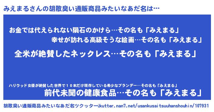 | 男性向けラノベタイトル風あだ名 | 『みえまる~年齢イコール彼女いない歴の魔法使い~』 |