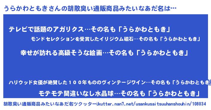 | 女子向けラノベタイトル風あだ名 | 『うらかわともきの雑貨屋さん』 |