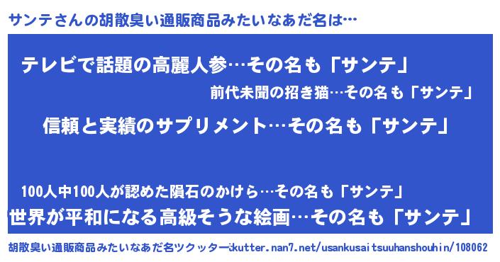 | 意味不明あだ名 | 『とにかく怪しいサンテ』『自称サンテ』 |