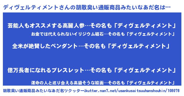 | 男性向けラノベタイトル風あだ名 | 『ディヴェルティメント~年齢イコール彼女いない歴の魔法使い~』 |