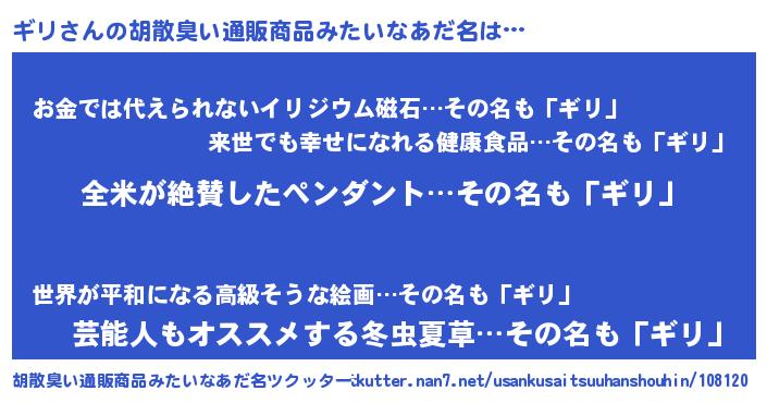 | ヘコむあだ名 | 『ギリっちょ』『ギリ(爆)』『豆乳』 |