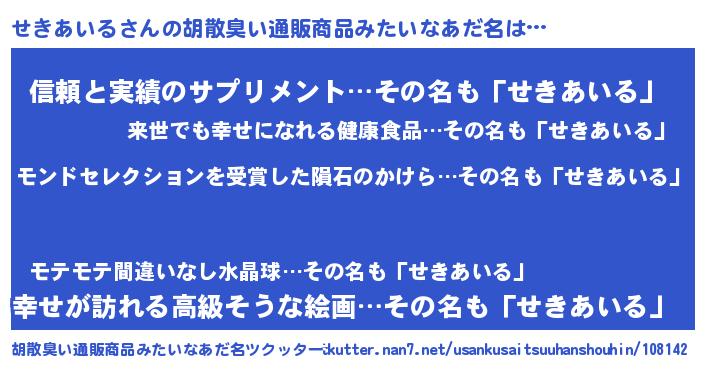 | ヒーロー風カッコイイあだ名 | 『天空の使者せきあいる』『魔戒騎士セキ』 |