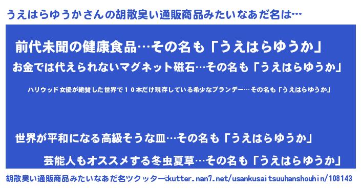 | 意味不明あだ名 | 『住所不定無職うえはらゆうか(77歳)』 |