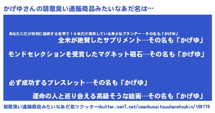 | 男性向けラノベタイトル風あだ名 | 『かげゆに滅ぼされるだけの簡単なお仕事です』 |