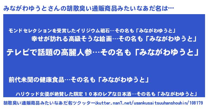 | 男性向けラノベタイトル風あだ名 | 『Re:みながわゆうとから始める異世界生活』 |
