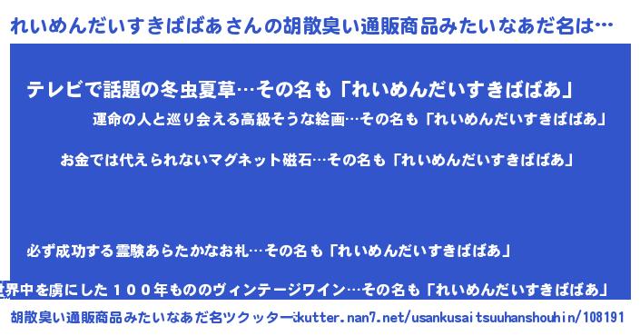 | 男性向けラノベタイトル風あだ名 | 『おまえをオタクにしてやるから、俺をれいめんだいすきばばあにしてくれ! 』 |