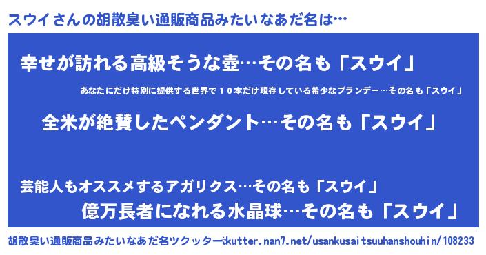 | 意味不明あだ名 | 『とにかく怪しいスウイ』『自称スウイ』 |