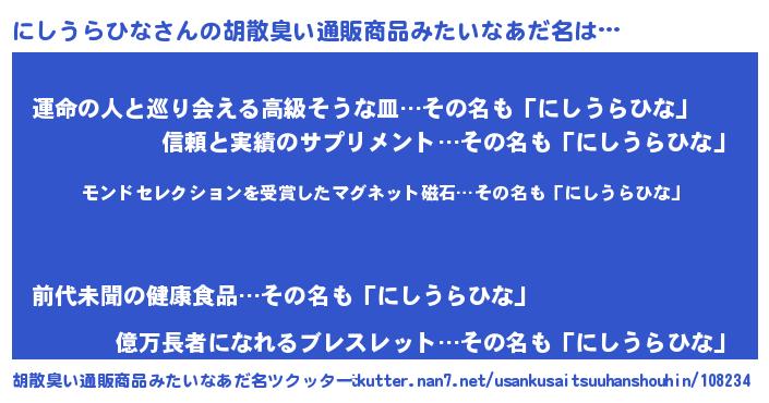 | 男性向けラノベタイトル風あだ名 | 『うちのにしうらひなが世界を掌握している!』 |