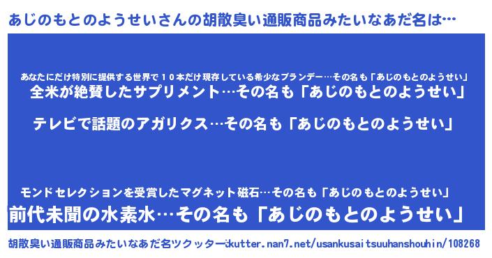| ヘコむあだ名 | 『あじのもとのようせい(笑)』『あじっぺ』 |