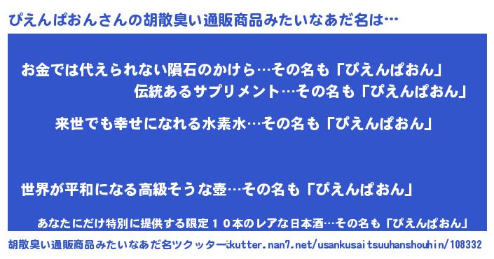 | 男性向けラノベタイトル風あだ名 | 『ぴえんぱおんという概念が存在しない退屈な世界 』 |