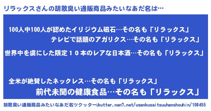 | 男性向けラノベタイトル風あだ名 | 『この素晴らしい世界にリラックスを!』 |