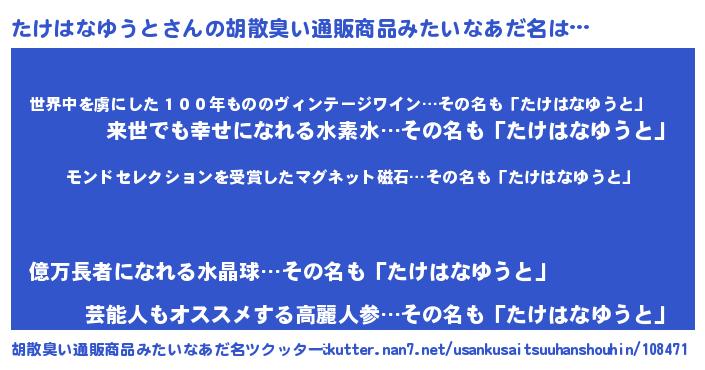| 男性向けラノベタイトル風あだ名 | 『うちのたけはなゆうとが世界を掌握している!』 |