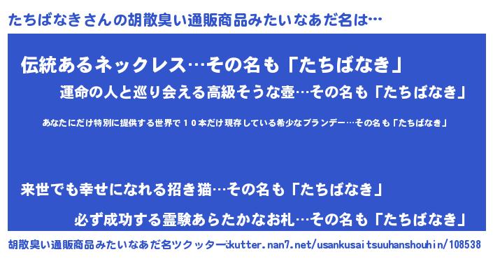 | 男性向けラノベタイトル風あだ名 | 『この素晴らしい世界にたちばなきを!』 |