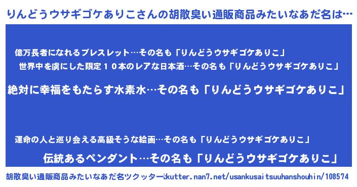 | 女子向けラノベタイトル風あだ名 | 『異世界で失敗しない100のりんどうウサギゴケありこ』 |