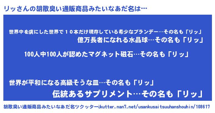 | ヘコむあだ名 | 『リッお』『リッふぇ~』『なまこ酢』 |