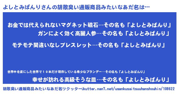 | 欧米人風あだ名 | 『よしとみばんり・ステッグマイヤー』 |