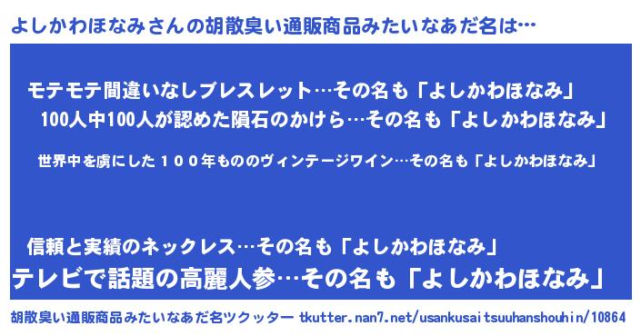 | 意味不明あだ名 | 『住所不定無職よしかわほなみ(6歳)』 |