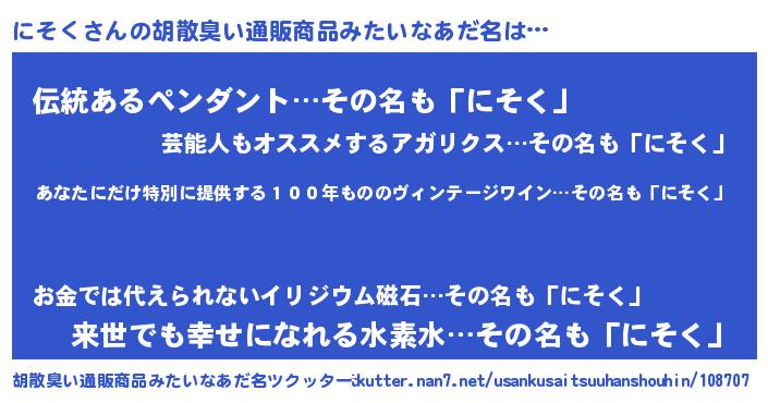 | ヘコむあだ名 | 『にそを』『にそく(苦笑)』『豆乳』 |