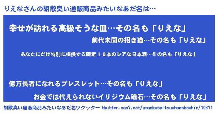 | 男性向けラノベタイトル風あだ名 | 『うちのりえなが世界を掌握している!』 |