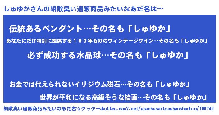 | 男性向けラノベタイトル風あだ名 | 『シュユカスレイヤー』『しゅゆかの憂鬱』 |