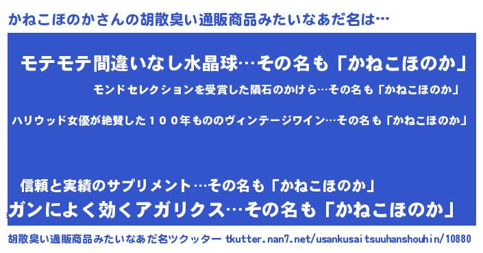 | 恥ずかしいあだ名 | 『プリティーかねこほのか』『かねっちょ』 |