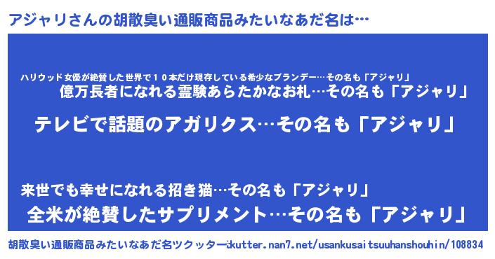 | 意味不明あだ名 | 『自称アジャリ』『めかぶ科アジャリ属』 |