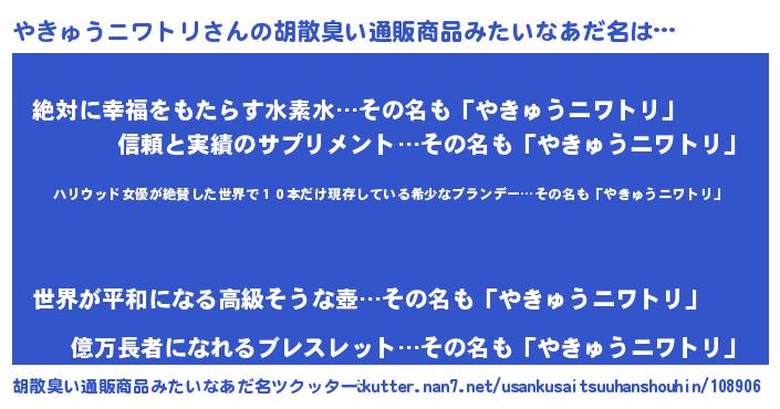 | 男性向けラノベタイトル風あだ名 | 『魔弾の王とやきゅうニワトリ』 |
