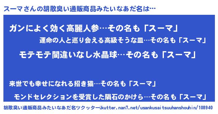 | 男性向けラノベタイトル風あだ名 | 『スーマの憂鬱』『はたらくスーマさま!』 |