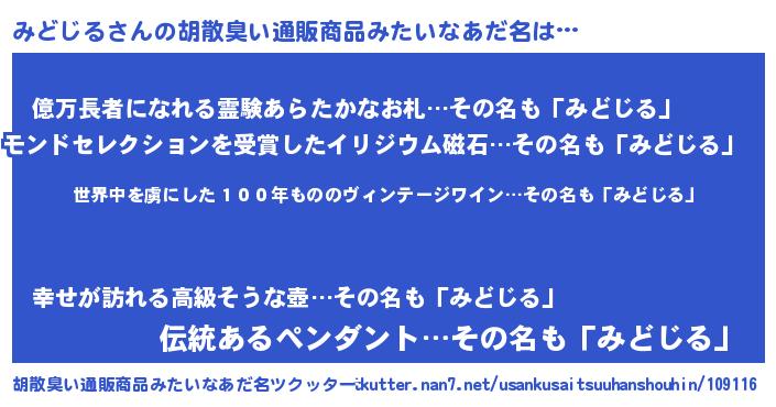 | 意味不明あだ名 | 『住所不定無職みどじる(6歳)』 |
