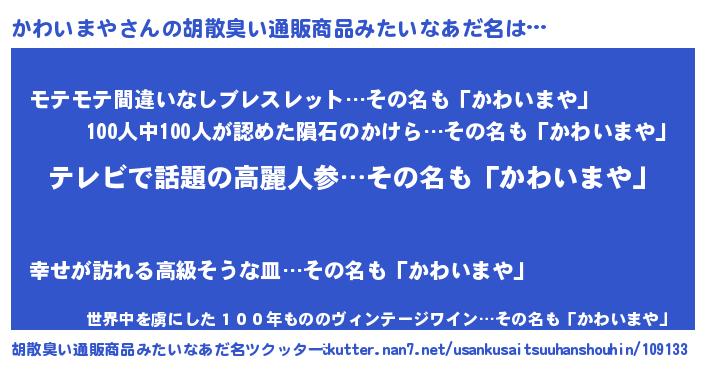| 男性向けラノベタイトル風あだ名 | 『かわいまやに滅ぼされるだけの簡単なお仕事です』 |
