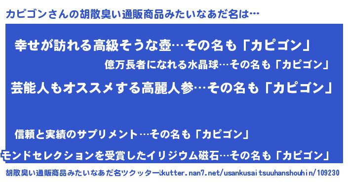 | 男性向けラノベタイトル風あだ名 | 『カピゴン~年齢イコール彼女いない歴の魔法使い~』 |