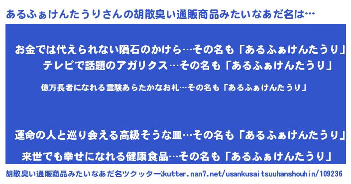 | ヘコむあだ名 | 『あるもー』『あるふぁけんたうり(小並感)』 |