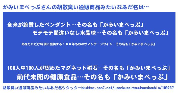 | 意味不明あだ名 | 『住所不定無職かみいまべっぷ(6歳)』 |