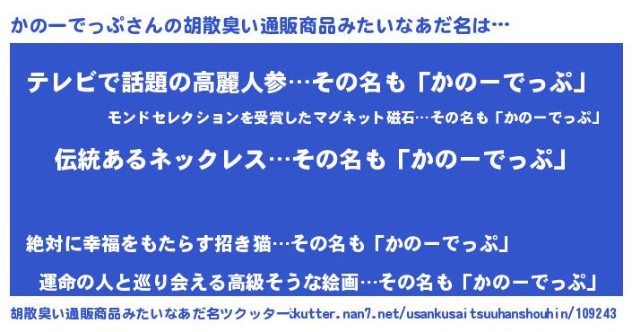 | 意味不明あだ名 | 『とにかく怪しいかのーでっぷ』 |