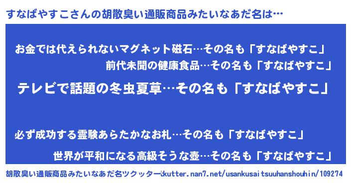 | ヘコむあだ名 | 『なまこ酢』『すなばやすこ(小並感)』 |