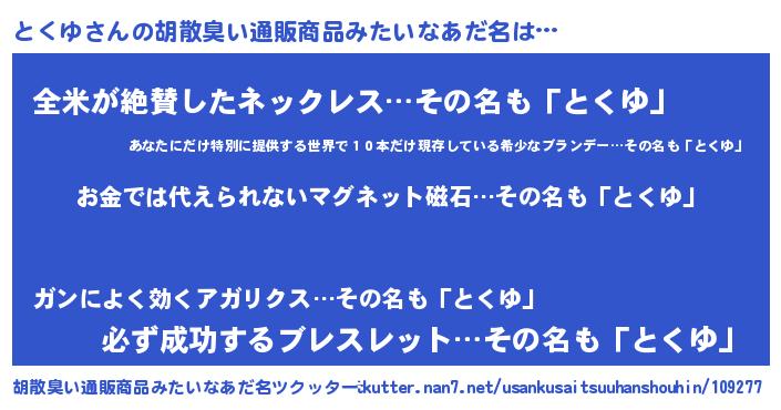 | ヒーロー風カッコイイあだ名 | 『慈愛の使者とくゆ』『炎刃騎士トク』 |