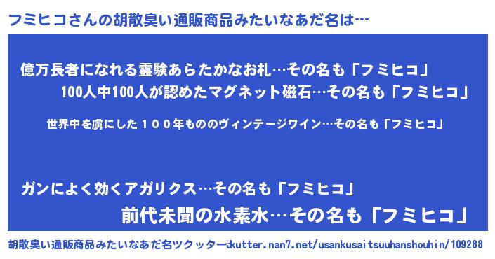 | 意味不明あだ名 | 『住所不定無職フミヒコ(8歳)』 |