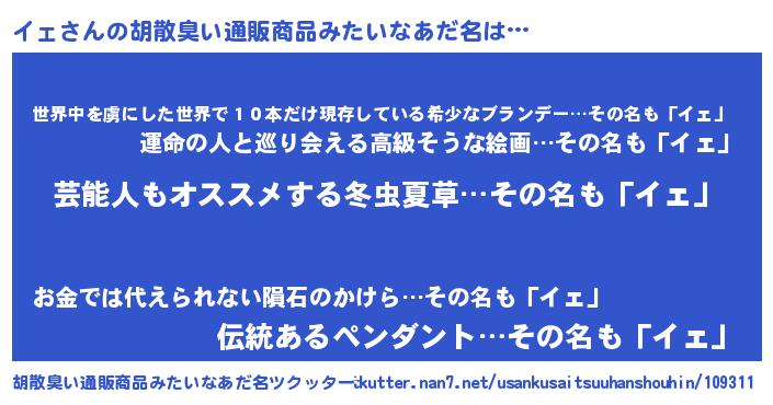 | ヘコむあだ名 | 『イェっぺ』『なまこ酢』『イェにー』 |