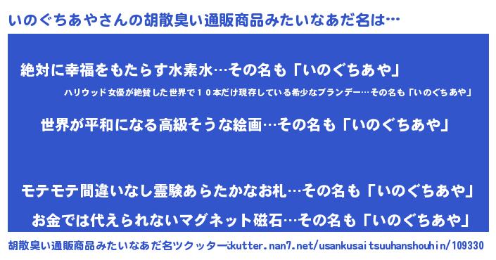 | 男性向けラノベタイトル風あだ名 | 『転生したらいのぐちあやだった件』 |