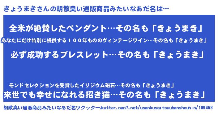 | 男性向けラノベタイトル風あだ名 | 『きょうまきの憂鬱』 |
