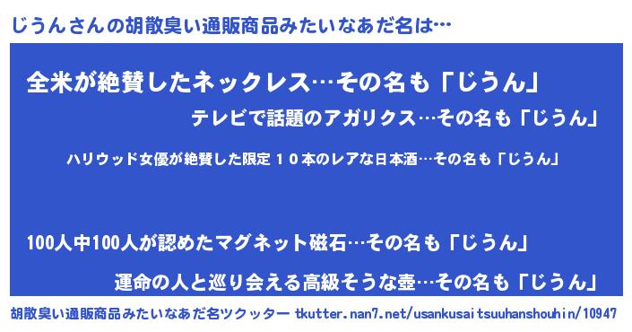 | 意味不明あだ名 | 『住所不定無職じうん(41歳)』『自称じうん』 |