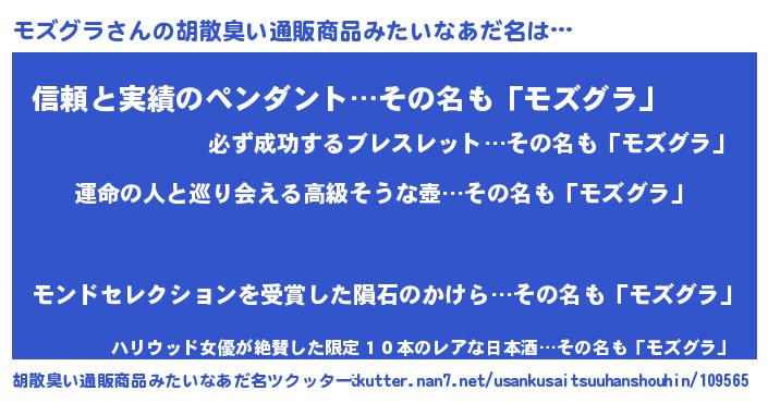 | 男性向けラノベタイトル風あだ名 | 『モズグラ~年齢イコール彼女いない歴の魔法使い~』 |