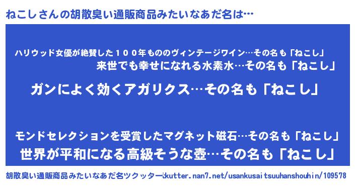 | 意味不明あだ名 | 『自称ねこし』『住所不定無職ねこし(91歳)』 |