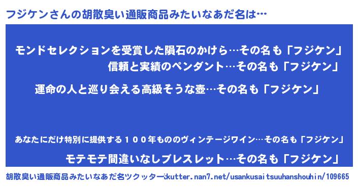 | 男性向けラノベタイトル風あだ名 | 『フジケン~年齢イコール彼女いない歴の魔法使い~』 |