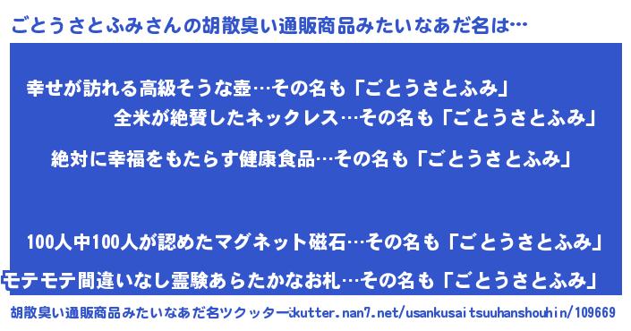 | ヘコむあだ名 | 『ごとうさとふみ(爆)』『豆乳』 |