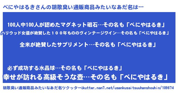 | 意味不明あだ名 | 『とにかく怪しいべにやはるき』 |
