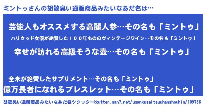 | 意味不明あだ名 | 『ミントゥフォーエバー』『自称ミントゥ』 |
