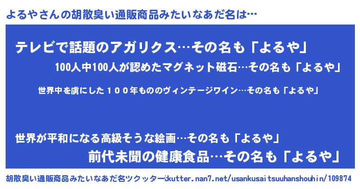 | 意味不明あだ名 | 『住所不定無職よるや(10歳)』『自称よるや』 |